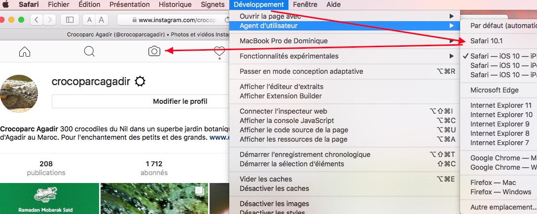 Il est maintenant possible de publier des photos depuis la version mobile du site web et là où ça devient très intéressant, c’est que avec Safari sur ordinateur, il suffit d’afficher le menu « Développement » et sélectionner « Agent utilisateur » IOS10 pour disposer de cette fonction de la même façon. Simple non ?