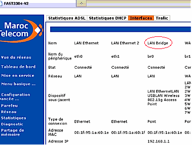 Configuration avancée -> Statistiques ->interfaces (contient l’ensemble des paramètres) et cliquer sur la nom de la colonne « LAN BRIDGE ». (et il faut désormais être connecté en mode root, voir commentaires plus bas)